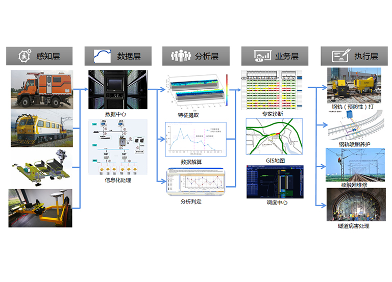 源自不同的智能檢測裝備的數(shù)據(jù)經(jīng)過數(shù)據(jù)中心整理、歸并、解算,生成過程性分析數(shù)據(jù)和直觀的判斷結(jié)果,最終對線路狀況提供運營維保的建議和意見。
